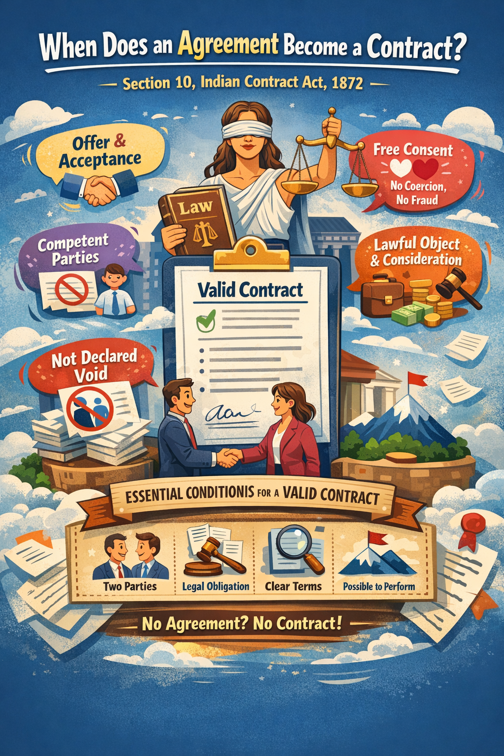 In everyday life, agreements are made casually, but not all of them carry legal weight. Under Section 10 of the Indian Contract Act, 1872, only those agreements that fulfill specific essential conditions become valid and enforceable contracts.